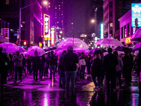 Crowds of people walking under an umbrella in Manhattan during the rain.