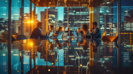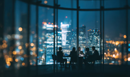Business people reviews documents on digital devices during a nighttime meeting.
