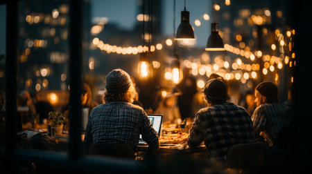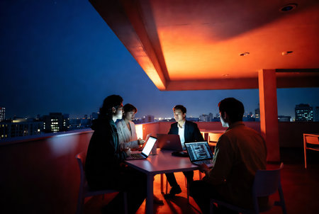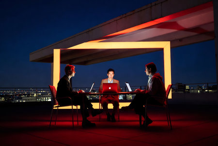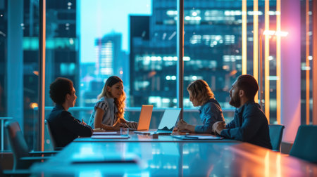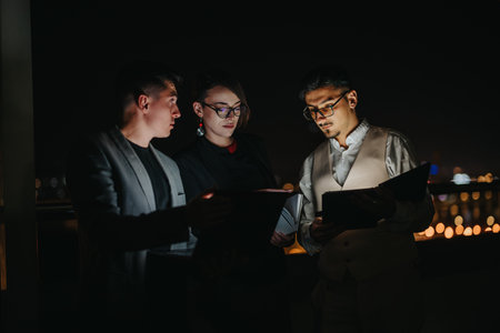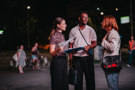 Diverse business professionals discussing strategies in a nighttime urban setting