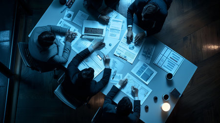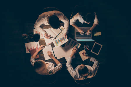 High angle above view photo of four business partners colleagues sitting table working together late night discussing new startup reading contract formalwear lamp light indoors