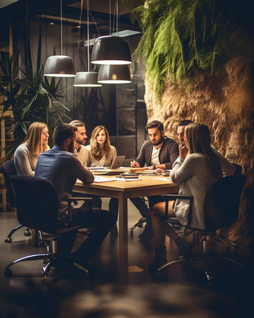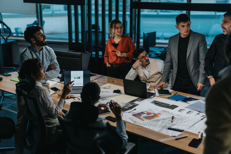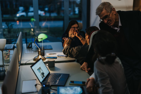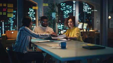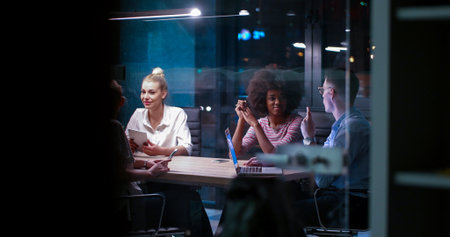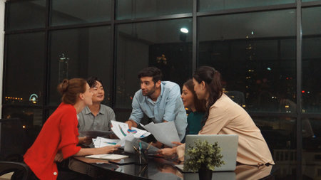 Diverse late-night business team collaborates on project details, aiming for growth and profit. Sharing ideas and working persistently for success.
