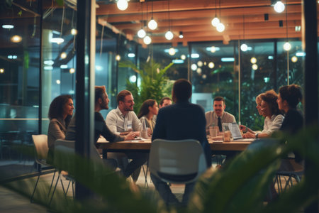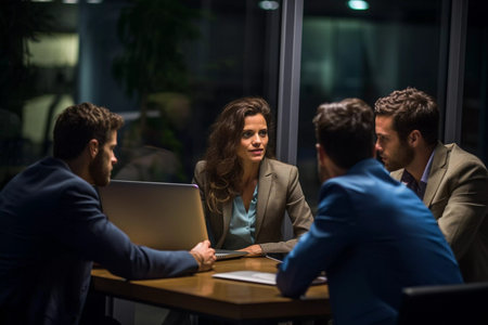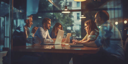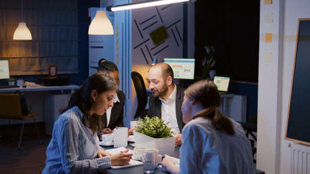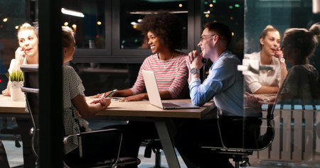 Late night teamwork of business people, discussing project details and collaborating on tasks planning for business growth and success.