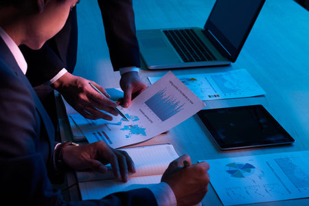 Group of multi-ethnic businesspeople checking company solution analyzing management graphs paperwork brainstorming ideas in office meeting room late at night. Teamwork solving corporate statistics