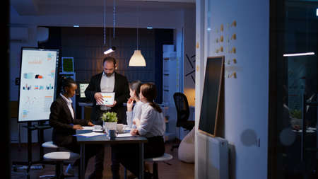 Workaholic overworked businessman explaining company strategy using tablet for presentation working overtime in meeting office room late at night. Diverse multi-ethnic teamwork brainstorming ideas
