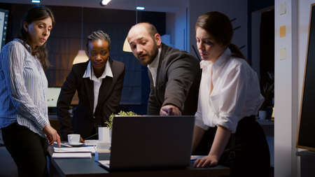 Diverse teamwork checking management presentation on laptop computer brainstorming company ideas. Multi ethnic businesspeople lean on conference table in office meeting room late at night