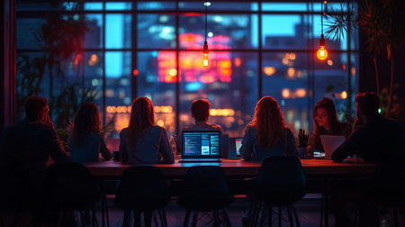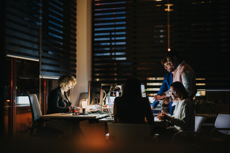 Diverse team collaborating in a dimly lit office late at night