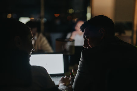 Colleagues collaborating on a late night project in a dimly lit office