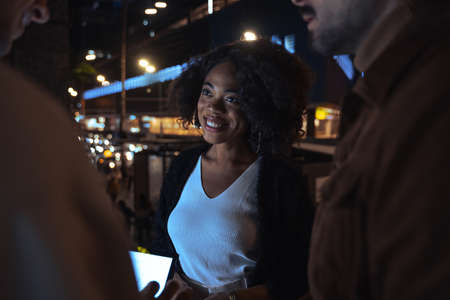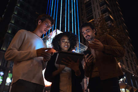 People standing together and smiling while working at the evening street with the tablet
