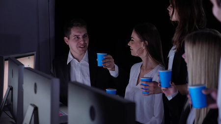 Men and women leaders team work at desks with monitors in dark office, yearend corporate meeting, boss saying birthday toast, team holding drink cups smiling.