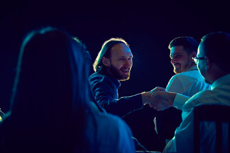 Successful business people are sitting in circle and discussing affairs while working in office late at night