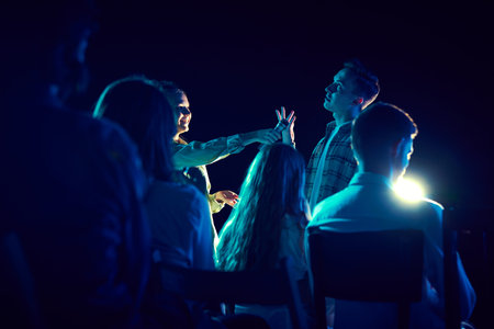Large group of theater actor artists on stage perform play for audience. Public performance. Theatre scene