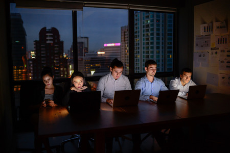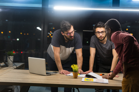 Multicultural business team working on a project at night to meet a deadline