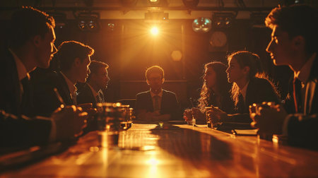 Group of young business people having a meeting in a night club.