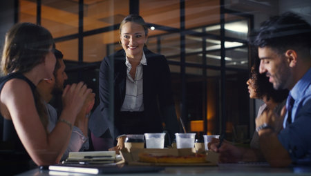 Business team working at night to achieve growth and profitability through innovation and collaboration.