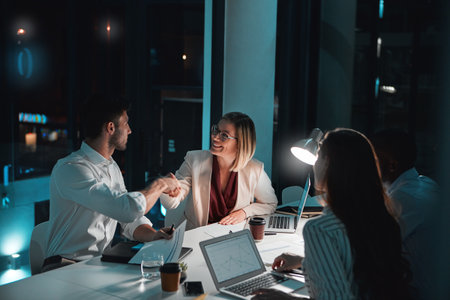They stayed late to close the deal. a businessman and businesswoman shaking hands during a late night meeting at work.