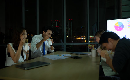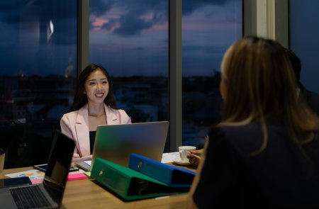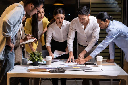 Work late concept of Interracial asian business team brainstorm idea at office meeting room at night. Work hard deadline and overtime working and new business start up concept.
