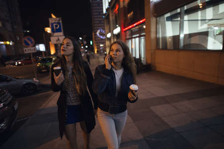 Two stylish girlfriends walking in city avenue at night