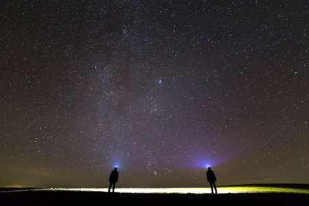 Back view of two men with head flashlights on green grassy field under beautiful dark blue summer starry sky. Night photography, beauty of nature concept. Wide angle shot, copy space background.