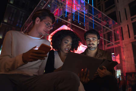 Diverse people discussing something and looking attentively at the laptop while sitting