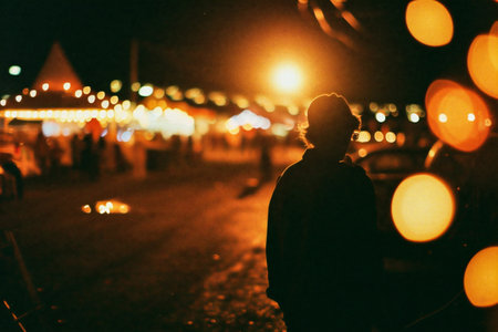 UFO concept. Glowing orbs, floating above a misty road at night. With a silhouetted figure looking at the lights.