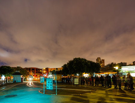 San Francisco, AUG 24 2014 - Twilight view of the Powell and Hyde Cable Car Turntable