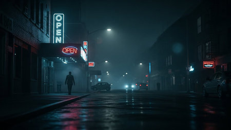A hooded figure back to camera standing on a empty road in a city on a foggy, winters night. Worcester, UK