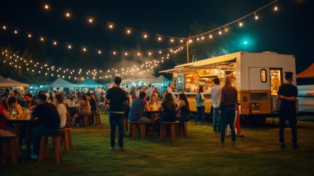Customers are buying and eating street food from a food truck at an outdoor night market, enjoying the festive atmosphere under string lights