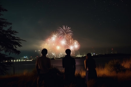 A small group of individuals captured in a serene moment, engrossed in the spectacle of vibrant fireworks illuminating the night sky