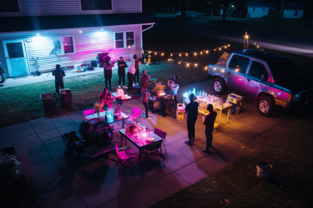 Vintage photo of people having party at night in the garden.
