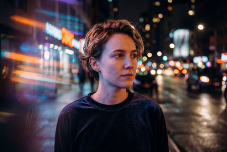 A serious young woman with short wavy hair stands on a wet urban street at night surrounded by blurred colorful neon city lights and glowing traffic trails in the background.