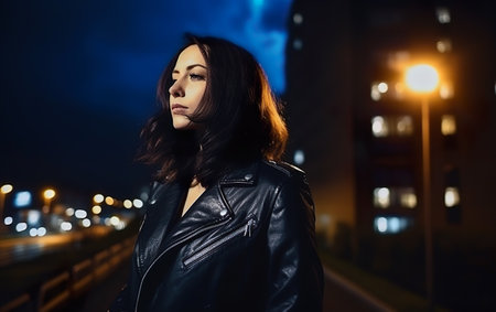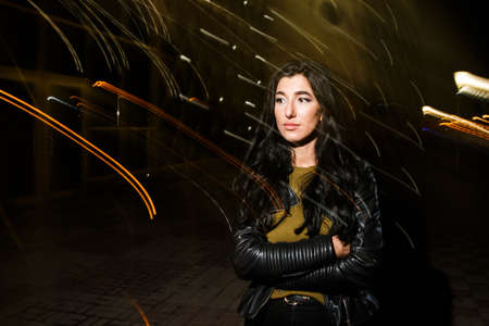 beautiful attractive woman with long dark hair at night in the street in a leather black jacket. freezlight