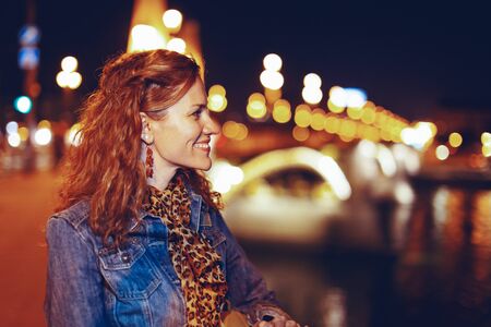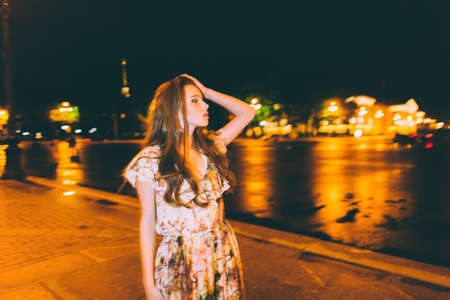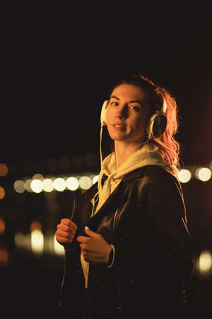 Portrait of beautiful young lady on city street in the night, evening lights bokeh background outdoors
