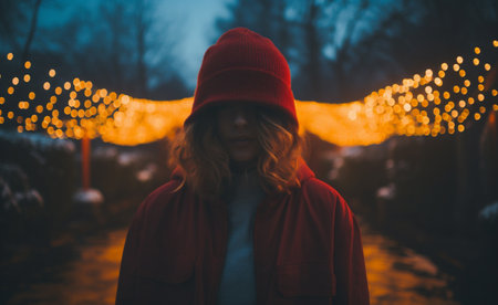 Beautiful young woman in red coat and hat on the street with christmas lights