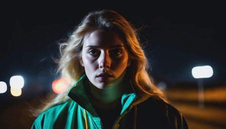 A young woman with long blonde hair stands contemplatively in a city lit by night lights.