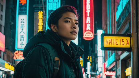 Fashionable young adult model in a zipper biker jacket standing on reflective wet city pavement under high contrast red and cyan neon signage at midnight.