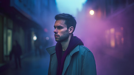 A young man with a confident expression poses against a backdrop of colorful lights at night in urban setting. A resident of Kazakhstan, a cute man of 25 years old. Student or applicant. AI generated.