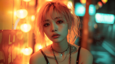 An up-close photo capturing the captivating beauty of Thai women as they lock eyes with the camera amidst the nocturnal cityscape