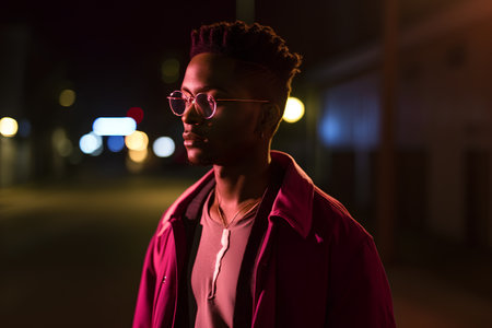 photo of beautiful adult african woman with hood coat standing posing for picture at night future city, generative AI