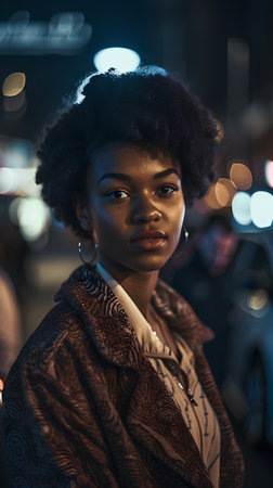 Fashionable woman on urban city street at night. Beautiful african american woman with black curly hair