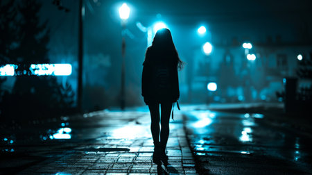 Silhouette of a young woman walking alone at night on a dark street generative ai