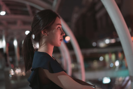 Depressed young Asian woman standing alone and lonely standing over footbridge looking away while thinking and daydreaming