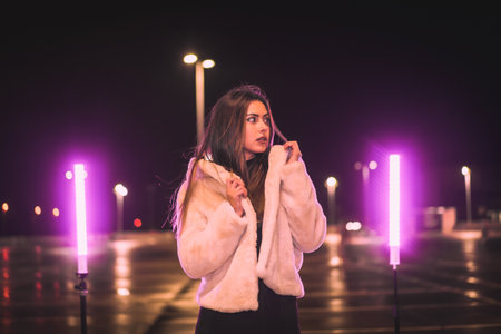 Young Caucasian brunette with wool jacket in an empty car park illuminated with pink light. Night urban winter session in the city