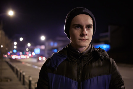 Portrait of man standing in night city street with copy space and place for text. Confident happy guy. Close-up portrait