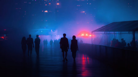 Under urban lights, silhouettes of people move through the city at night, capturing the essence of modern youth culture and lifestyle.