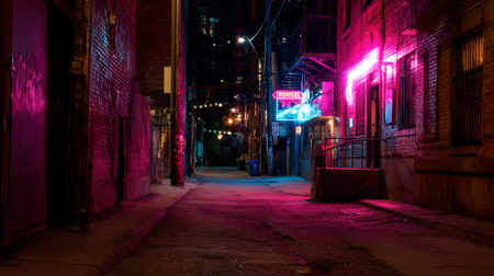A captivating image of a vibrant urban alleyway illuminated by colorful neon lights at night, creating a unique and atmospheric urban scene.