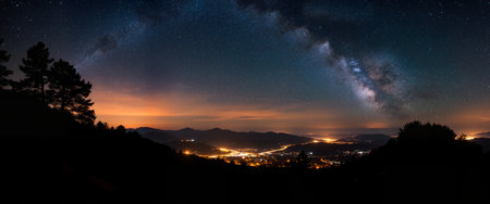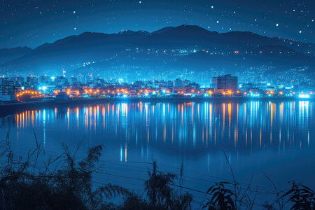 Starry night reveals vibrant city lights against a contrasting dark sky