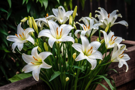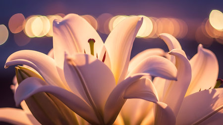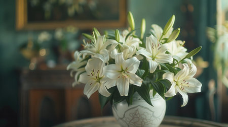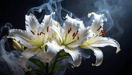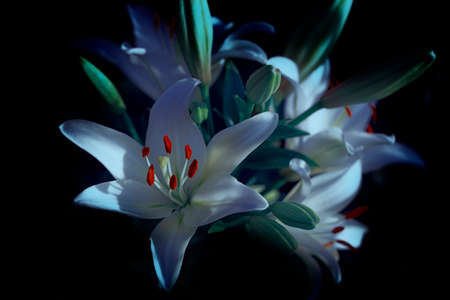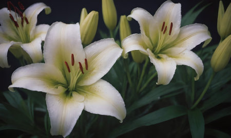 Elegant Dark Moody Garden Still Life with Glowing Fresh Lilies and White Flowers Close-Up Scene