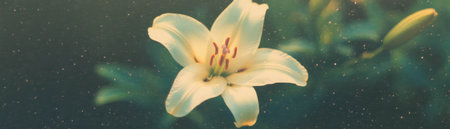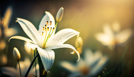 An AI generated illustration of a delicate white lily blooming in a sunny lush green grassy field