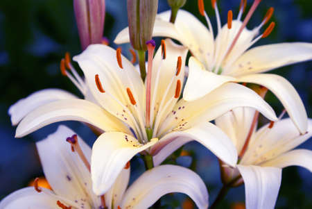 Beautiful white lily in the garden outdoors, lily blossom, spring time, nature bloom.