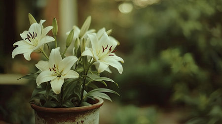 A beautiful arrangement of elegant white lilies in a rustic pot, set against a soft green background, perfect for themes of nature, tranquility, and home decor.